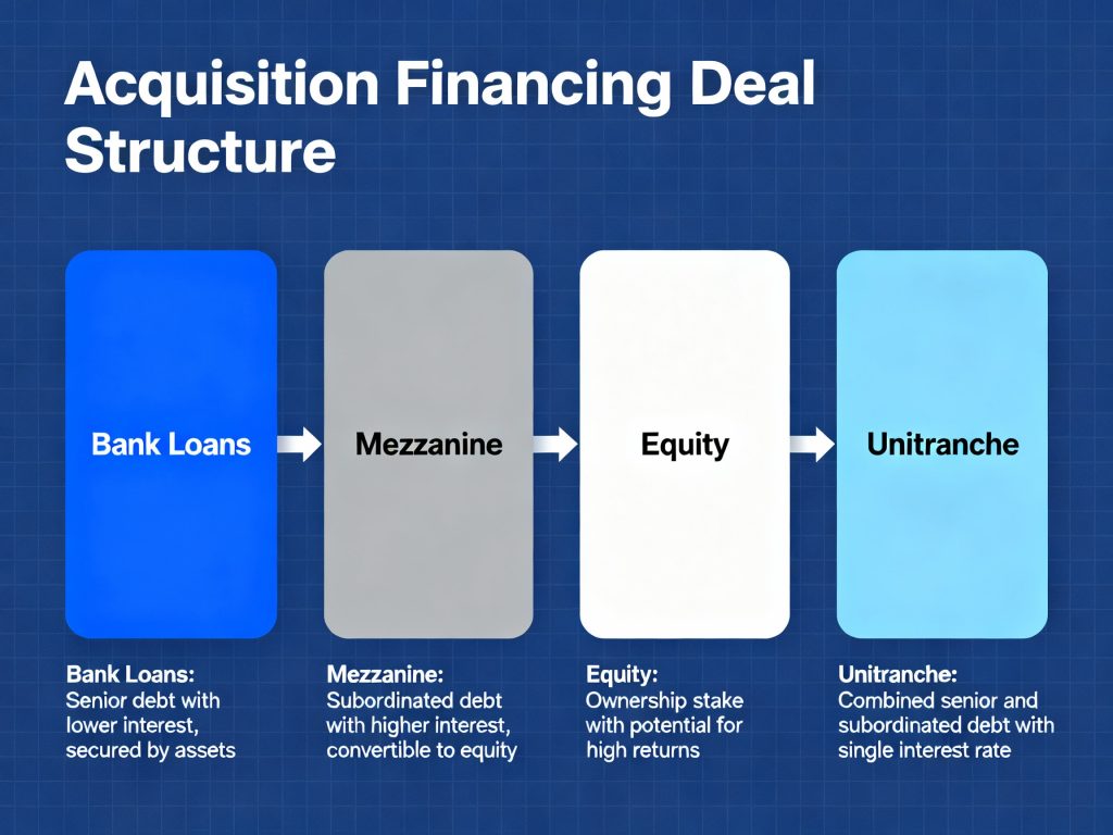 Acquisition Financing is the key ingredient for all deals. There are many forms of acquisition financing including bank loans, term loans, mezzanine loans, equity investment and unitranche loans. Each acquisition financing requirement should be carefully structured to ensure enough capital, repayment flexibility and time for the acquired company to mature. All acquisition structures are unique. Your structure depends on the projected level of growth, investment needed, and time required to make it all happen. It usually takes 3 to 4 years for the value to be realized from the acquisition, making it a long-term play. This fact demands a conservative approach to capital planning, as things usually take longer and may be more expensive than expected.